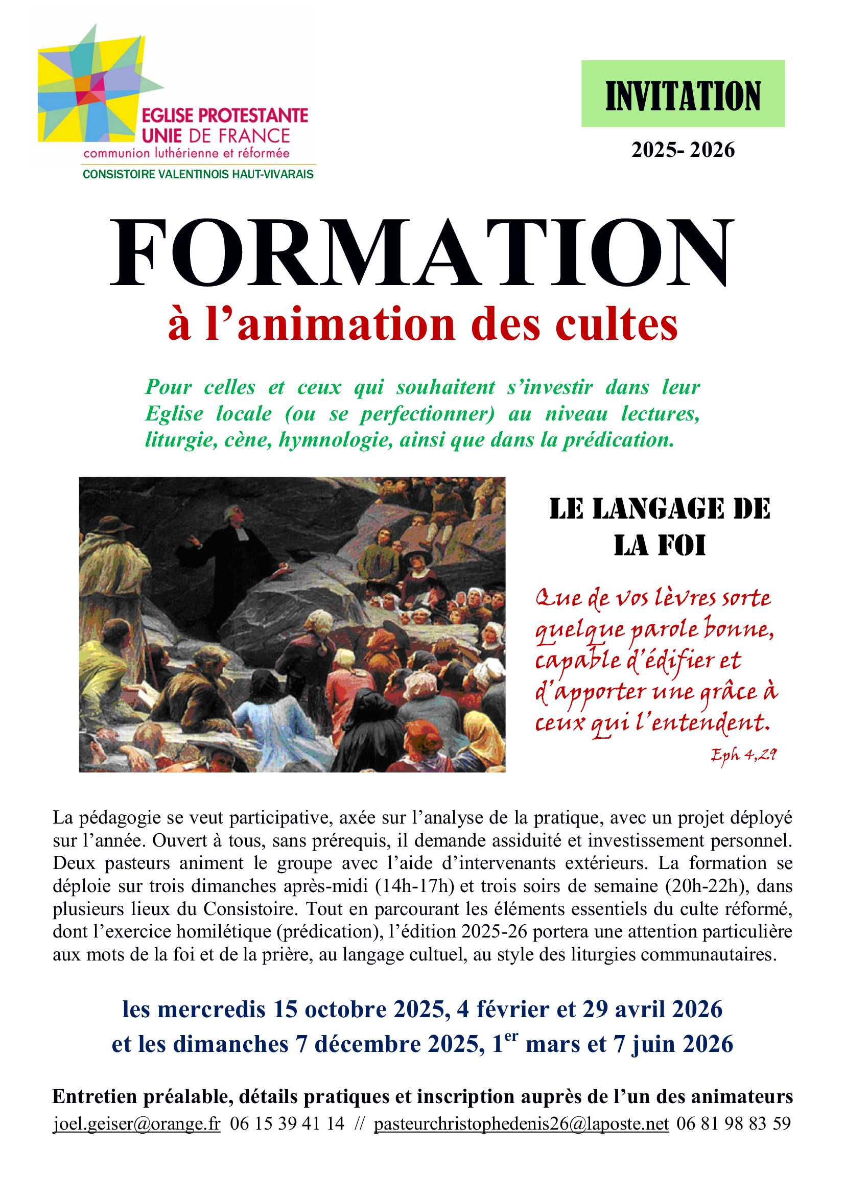 Vous trouverez ci-joint l’affiche/tract annonçant le parcours 2025-2026 de formation à l’animation des cultes proposé par notre Consistoire. Avec Christophe Denis, les participants de l’an passé et le Conseil, il nous semble important de maintenir cette offre, afin d’affermir et affiner nos compétences, mais également de la proposer à de nouveaux venus, membres de nos Eglises intéressés par un engagement (ou déjà investis) dans la liturgie ou la prédication.