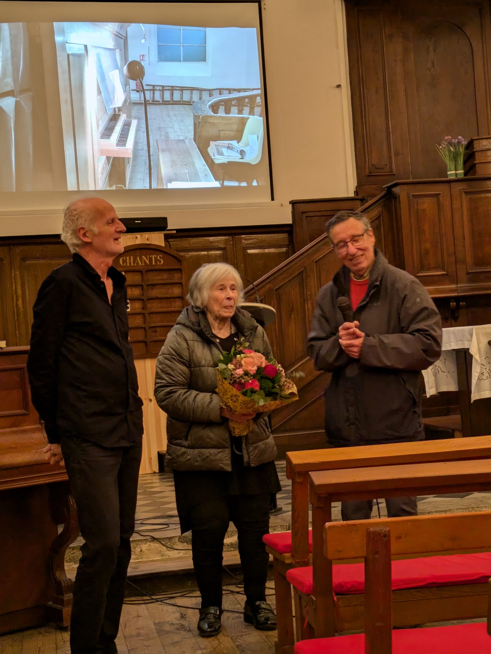 Les Amis de l’orgue du temple ont accueilli ce dimanche Gilles Harlé, organiste titulaire de l’orgue du temple des Billettes à Paris et Nicole Palmieri, organiste titulaire de l’orgue du temple d’Annonay ; ils ont donné un concert en duo pour interpréter Tomkins (1572-1656) et Mozart (1756-1791) et en solo par Gilles Harlé, Byrd, Bach, Sweelinck et Buxtehude, compositeurs des 16°, 17° et 18° siècle. Gilles Harlé a présenté les œuvres, ce qui est toujours très interessant. Le public a pu apprécier la projection du concert sur le nouvel écran très lumineux acquis par les Amis de l’orgue, ce qui permet de voir le jeu des mains et des pieds des organistes. La soirée s’est terminée par un verre de l’amitié à la tribune où chacun a pu échanger avec les musiciens.