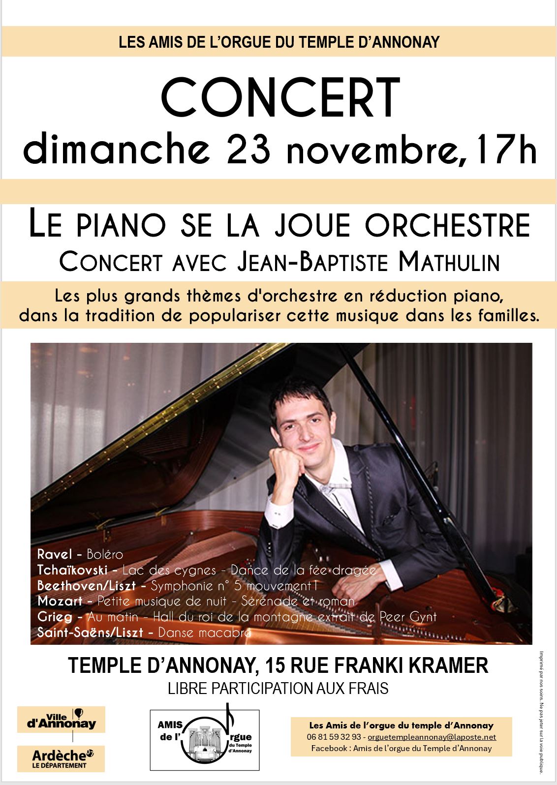 Les Amis de l’orgue vous proposent leur prochain concert exceptionnel avec Jean-Baptiste Mathulin et son piano à queue (son site : jeanbaptistemathulin.com) dimanche 23 novembre à 17h au temple d’Annonay, 15 rue Franki Kramer.