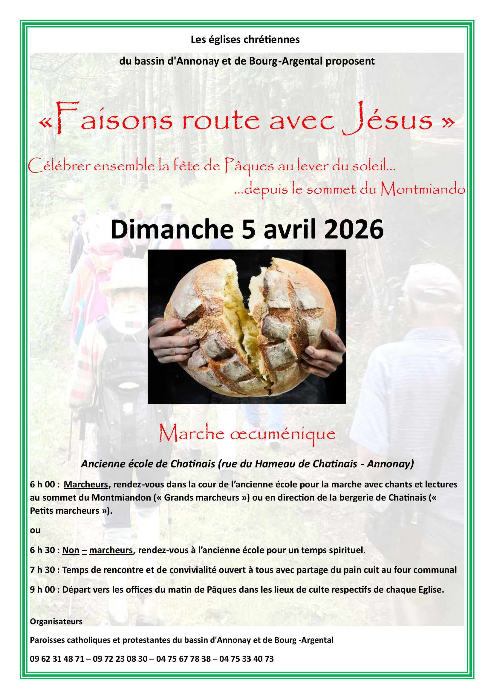Au matin de Pâques, les Églises chrétiennes du bassin d’Annonay et de Bourg-Argental proposent une marche œcuménique sous le thème : « Faisons route avec Jésus ».