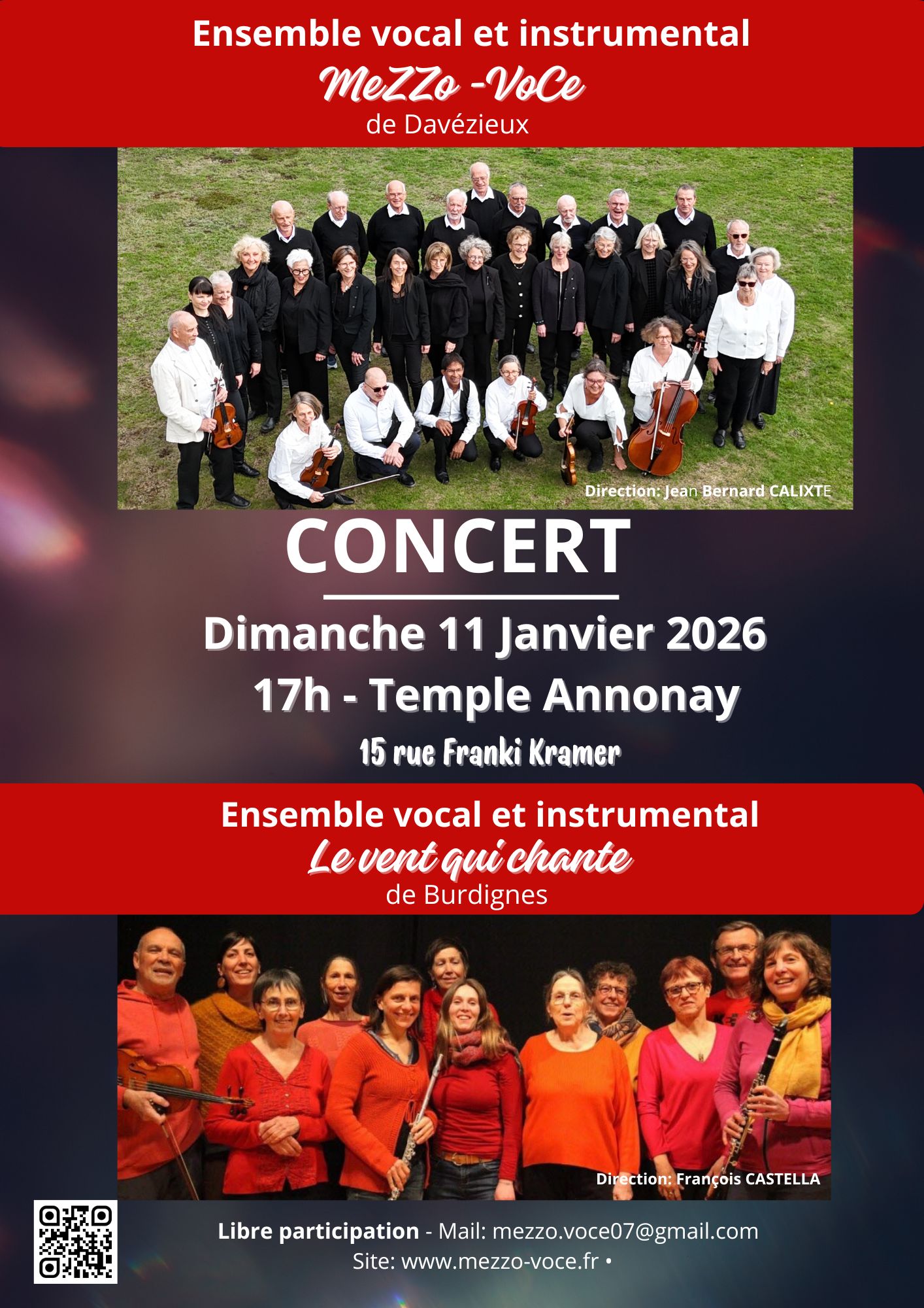 Le vent qui chante (Burdignes) : Dirigé par François CASTELLA, ce groupe apporte une touche chaleureuse et authentique, complétant parfaitement le programme de cette fin d’après-midi. Il est composé de 12 choristes sopranes, altos et basses et de cinq instrumentistes qui jouent sur flûte traversière, clarinette (avec Violaine Missemer), violon, saxo baryton, clavier et percussions. Leur répertoire est très éclectique : chants et musiques anciennes, chants de différents pays, chants de lutte, musique des Balkans…Le concert se déroulera dans le cadre acoustique privilégié du Temple, offrant aux spectateurs une expérience immersive.Libre participation aux frais.