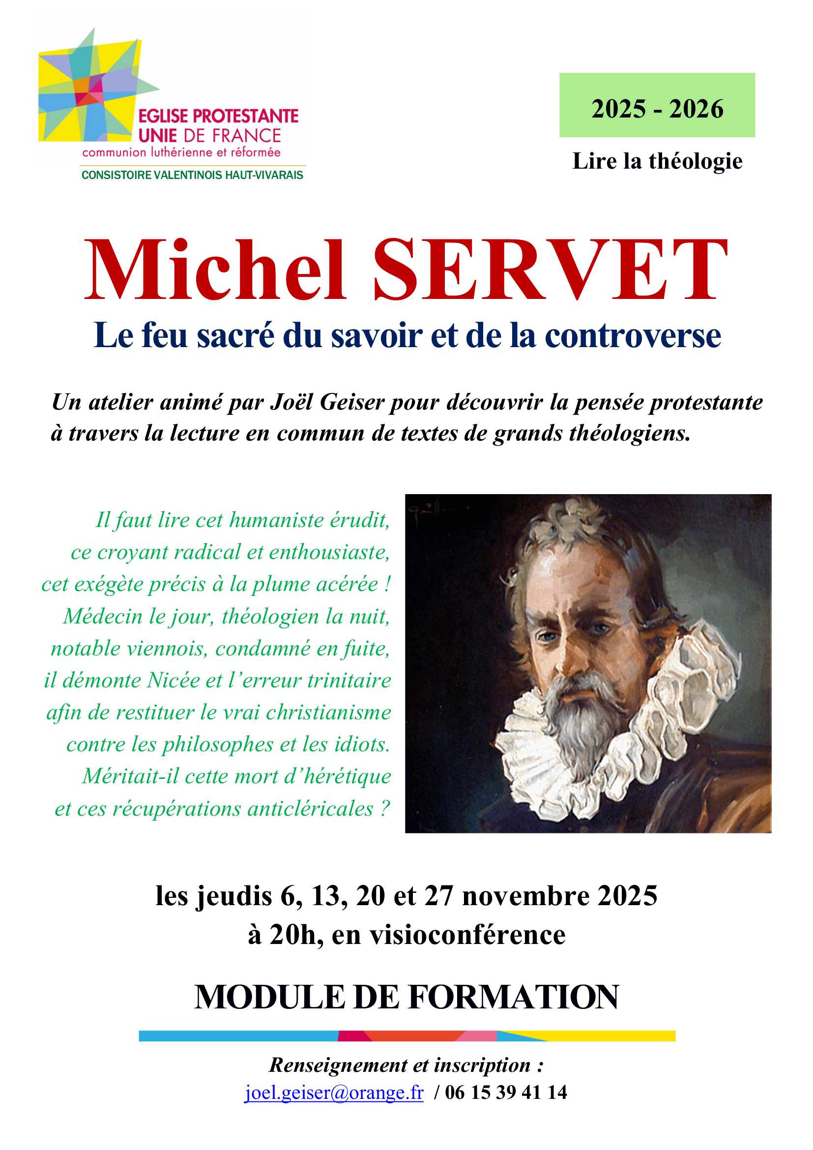 Chaque jeudi soir de novembre, en visio, nos découvrirons, dans le texte, la pensée radicale et enthousiaste de l’humaniste et théologien Michel Servet. Après avoir commémoré oecuméniquement le Concile de Nicée, ses textes anti-trinitaires nous bousculeront ! Sa manière de « restituer le vrai christianisme », soucieuse des Ecritures, nous amènera-t-elle à prononcer sa réhabilitation posthume ?